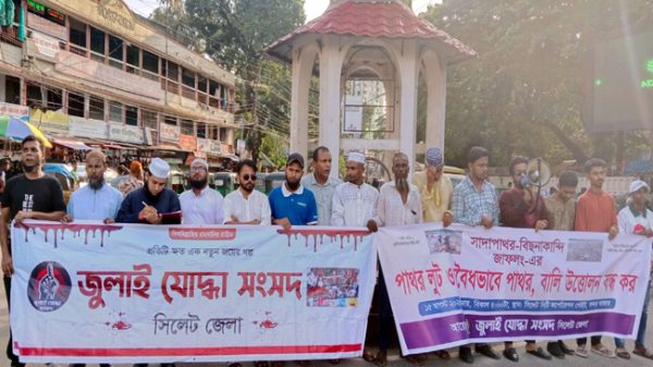 » ৫ দফা দাবিতে জুলাই যোদ্ধা সংসদ সিলেটের মানববন্ধন