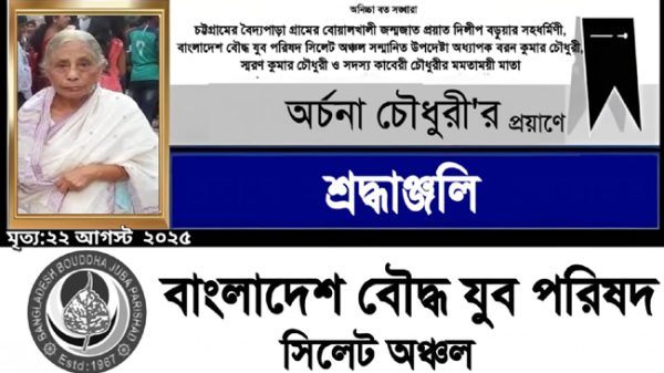 » বাংলাদেশ বৌদ্ধ যুব পরিষদ সিলেট অঞ্চল উপদেষ্টা অধ্যাপক বরণ কুমার চৌধুরী’র মাতা অর্চনা চৌধুরী পরলোকে