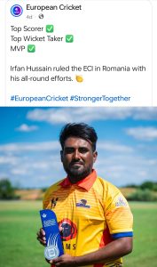 » ইউরোপিয়ান ক্রিকেট লীগে সর্ব্বোচ্চ রান সংগ্রাহক ও সর্ব্বোচ্চ উইকেট শিকারী রোমানিয়া জাতীয় ক্রিকেট দলের অলরাউন্ডার সিলেটের সন্তান ইরফান হোসেন রিংকু :