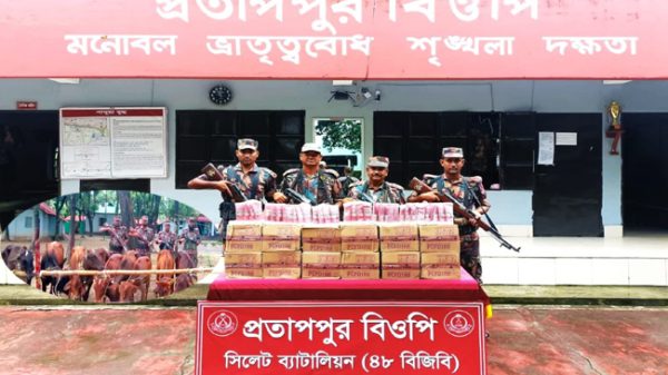 গতকাল বুধবার ০৪(সেপ্টেম্বর) গোপন সংবাদের ভিত্তিতে সিলেট ব্যাটালিয়ন (৪৮ বিজিবি) এর দায়িত্বাধীন উপজেলার বাংলাবাজার, তামাবিল, উৎমা, বিছনাকান্দি, প্রতাপপুর, সংগ্রাম ও ডিবির হাওর বিওপির সীমান্তে চোরাচালান বিরোধী অভিযান পরিচালনা করে বিপুল পরিমান ভারতীয় শাড়ী, সানগ্লাস, গরু, চকলেট, পুডিং পাউডার, পন্ডস ব্রাইট বিউটি ফেসওয়াস, চা-পাতা, এবং চিনি বাংলাদেশী শিং মাছ আটক করে। আটককৃত মালামালের আনুমানিক বাজার মূল্য ১,৩৬,২৭,৫৮০ টাকা।