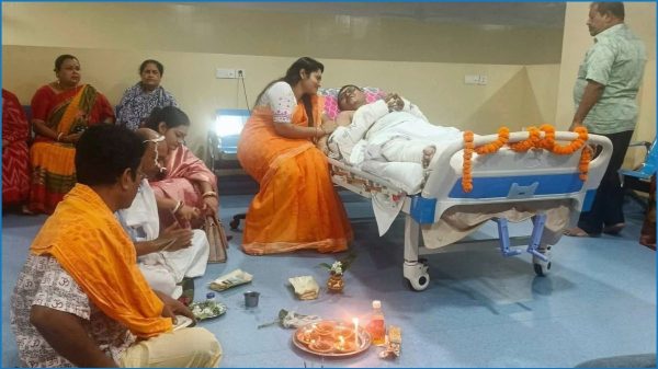বাইক দুর্ঘটনায় আহত বর আনন্দ সাহা হাত-পায়ে ব্যান্ডেজ বেঁধে শয্যাশায়ী ছিলেন। তবুও নির্ধারিত লগ্ন শেষ হয়ে যাওয়ার ভয়ে থেমে থাকেনি বিয়ের আয়োজন। পরিবারের সদস্যরা হাসপাতাল কর্তৃপক্ষের সহযোগিতায় সম্পন্ন করেন জীবনের এই বিশেষ মুহূর্ত।