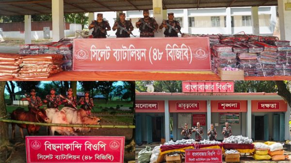 বিজিবির বাংলাবাজার ও বিছনাকান্দি বিওপি কর্তৃক পরিচালিত অভিযানে ভারতীয় গরু, মোটরসাইকেল মিটার, ফুচকা ও মোটরসাইকেলের বিভিন্ন যন্ত্রাংশ জব্দ করা হয়। অন্যদিকে ব্যাটালিয়ন সদর থেকে একটি বিশেষ টহলদল সিলেট জেলার জৈন্তাপুর উপজেলার ফেরিঘাট এলাকায় টাস্কফোর্স অভিযান চালিয়ে ভারতীয় শাড়ি, লেহেঙ্গা, থান কাপড় ও বিপুল পরিমাণ ওষুধ আটক করে।