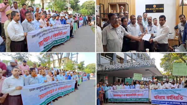 মঙ্গলবার (১৪ অক্টোবর) বেলা ২ টায় মানববন্ধন কর্মসূচি পালন করা হয় পরে শিক্ষক নেতৃবৃন্দ জেলা প্রশাসক বরাবরে স্মারকলিপিক প্রদান করেন।