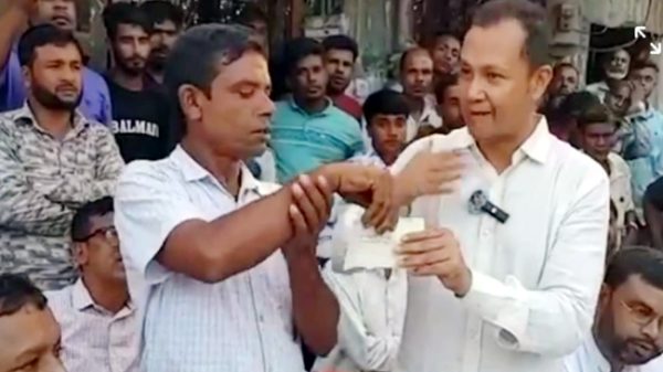 কামরুল। একপর্যায়ে কর্মীরা তাঁকে ফুল ও টাকার মালা গলায় দিয়ে শুভেচ্ছা জানান। তখন নূর কাসেম নামের এক কর্মী মঞ্চে উঠে কামরুজ্জামানের হাতে নির্বাচনে খরচের জন্য একটি চেক তুলে দেন। কামরুল সেটি হাতে নিয়ে দেখেন, ১০ লাখ টাকার চেক। পরে তিনি চেকটি সমাবেশে উপস্থিত দলের নেতা–কর্মীদের দেখান।