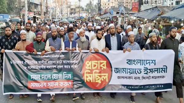 মিছিল সমাবেশে নেতৃবৃন্দ বলেন, আসন্ন জাতীয় নির্বাচনের আগে জুলাই জাতীয় সনদ বাস্তবায়ন আদেশের ওপর গণভোট, নির্বাচনে লেভেল প্লেয়িং ফিল্ডসহ পাঁচ দাবি ও গণভোটে ‘হ্যাঁ’ বিজয় নিশ্চিতে আগামী ৬ ডিসেম্বর শনিবার বেলা ১২টায় সিলেটের ঐতিহাসিক আলিয়া মাদ্রামা মাঠে ইসলামী ও সমমনা ৮ দলের সিলেট বিভাগীয় সমাবেশ অনুষ্ঠিত হবে। জামায়াত ও ৮ দলের সর্বস্তরের জনশক্তি ছাড়াও সিলেটবাসীর অংশগ্রহণে উক্ত সমাবেশ জনসমুদ্রে পরিনত হবে। ইনশাআল্লাহ। জাতীয় নির্বাচনের আগে জুলাই সনদ বাস্তবায়ন আদেশের ওপর গণভোট, নির্বাচনে লেভেল প্লেয়িং ফিল্ডসহ পাঁচ দাবি ও গণভোটে ‘হ্যাঁ’ বিজয় নিশ্চিতে আমাদের কর্মসূচী অব্যাহত থাকবে।