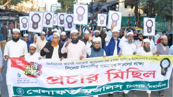 নির্বাচনের আগে গণভোট সহ ৫ দফা দাবিতে আগামী ৬ ডিসেম্বর সিলেট বিভাগীয় সমাবেশ সফলের লক্ষ্যে খেলাফত মজলিস সিলেট মহানগর শাখার প্রচার মিছিল ও সমাবেশে সভাপতির বক্তব্যে তিনি উপরোক্ত কথাগুলো বলেন। আজ ৩ ডিসেম্বর বুধবার বাদ আসর বন্দরবাজার কেন্দ্রীয় জামে মসজিদ থেকে প্রচার মিছিলটি শুরু হয়ে নগরীর গুরুত্বপূর্ণ সড়ক প্রদক্ষিণ শেষে শহীদ মিনারে গিয়ে সমাবেশ অনুষ্ঠিত হয়। মহানগর শাখার সভাপতি হাফিজ মাওলানা তাজুল ইসলাম হাসানের সভাপতিত্বে ও সাংগঠনিক সম্পাদক হাফিজ মাওলানা মনজুরে মাওলার পরিচালনায় অনুষ্ঠিত প্রচার মিছিল পরবর্তী সমাবেশে বক্তব্য রাখেন ও উপস্থিত ছিলেন সিলেট মহানগর সহ-সভাপতি মাওলানা শাহ আশিকুর রহমান, মাওলানা শামসুদ্দিন মুহাম্মদ ইলয়াস, আব্দুল হান্নান তাপাদার, ডা. মুহাম্মদ ফয়জুল হক, সিলেট জেলা সাধারণ সম্পাদক মাওলানা দিলওয়ার হোসাইন, মহানগর সহ-সাধারণ সম্পাদক প্রভাষক আহমদ সাইফুর রহমান, মাসুদ আহমদ, ইসলামী ছাত্র মজলিসের কেন্দ্রীয় প্রতিনিধি পরিষদ সদস্য ও সিলেট মহানগর শাখার সভাপতি মুহিবুর রহমান রায়হান, ইসলামী যুব মজলিস সিলেট মহানগর শাখার সাধারণ সম্পাদক আফজাল হোসাইন কামিল, শ্রমিক মজলিস সিলেট মহানগর শাখার সভাপতি মাওলানা আব্দুর রহিম প্রমুখ।