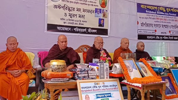 সিলেট বিএম ডেস্ক ::: বাংলাদেশ বৌদ্ধ যুব পরিষদ সিলেট অঞ্চল এর উদ্যোগে শ্রীমঙ্গলে সংঘদান অষ্টপরিস্কার সহ সংঘদানে অংশগ্রহন ও সাংগঠনিক সফর। গত শুক্রবার ৫ ডিসেম্বর ২০২৫ বাংলাদেশ বৌদ্ধ যুব পরিষদ সিলেট অঞ্চল এর উপদেষ্টা অধ্যক্ষ বরন কুমার চৌধুরী ও স্মরন কুমার চৌধুরী’র প্রয়াত পিতা দিলীপ কুমার চৌধুরী, মাতা প্রয়াত অর্চনা চৌধুরী ও কনিষ্ঠ ভ্রাতা মিত্র কুমার চৌধুরী’র পারলৌকিক শান্তি-সুখ কামনায় শ্রীমঙ্গের দেববাড়ীর স্মরণ কুমার চৌধুরীর বাস ভবনে অষ্টপরিষ্কারসহ সংঘদান ও স্মরণ সভা অনুষ্ঠিত হয়।