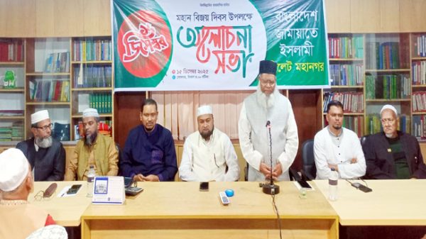 তিনি সোমবার (১৫ ডিসেম্বর) মহান বিজয় দিবস উপলক্ষে সিলেট মহানগর জামায়াত আয়োজিত আলোচনা সভায় সভাপতির বক্তব্যে উপরোক্ত কথা বলেন। মহানগর সহকারী সেক্রেটারী জাহেদুর রহমান চৌধুরীর পরিচালনায় অনুষ্ঠিত আলোচনা সভায় প্রধান অতিথির বক্তব্য রাখেন জামায়াতের কেন্দ্রীয় মজলিসে শুরা সদস্য, সিলেট জেলা আমীর ও সিলেট-১ আসনে জামায়াত মনোনীত সংসদ সদস্য পদপ্রার্থী মাওলানা হাবিবুর রহমান।