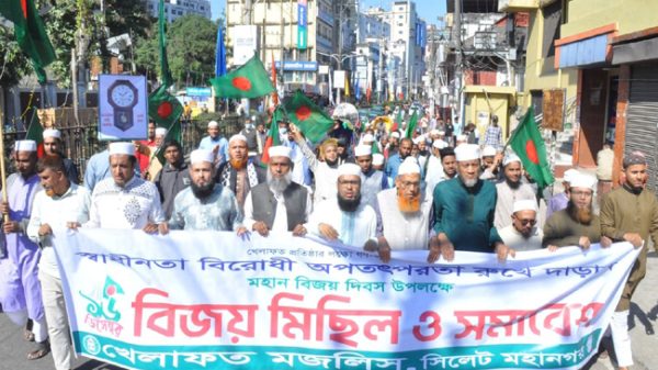 ১৬ ডিসেম্বর মহান স্বাধীনতা দিবসে খেলাফত মজলিস সিলেট মহানগর শাখার বিজয় মিছিল ও সমাবেশে সভাপতির বক্তব্যে তিনি উপরোক্ত কথাগুলো বলেন। গতকাল ১৬ ডিসেম্বর মঙ্গলবার সকাল ১১টায় নগরীর সুরমা পয়েন্ট থেকে বিজয় মিছিলটি শুরু হয়ে নগরীর গুরুত্বপূর্ণ সড়ক প্রদক্ষিণ শেষে কোর্ট পয়েন্টে এক সমাবেশ অনুষ্ঠিত হয়। মহানগর শাখার সভাপতি হাফিজ মাওলানা তাজুল ইসলাম হাসানের সভাপতিত্বে ও সাংগঠনিক সম্পাদক হাফিজ মাওলানা জাবেদুল ইসলাম চৌধুরীর পরিচালনায় অনুষ্ঠিত বিজয় মিছিল পরবর্তী সমাবেশে বক্তব্য রাখেন ও উপস্থিত ছিলেন সিলেট মহানগর সহ-সভাপতি মাওলানা শাহ আশিকুর রহমান, মাওলানা শামসুদ্দিন মুহাম্মদ ইলয়াস, আব্দুল হান্নান তাপাদার, ডা. মুহাম্মদ ফয়জুল হক, কে.এম আব্দুল্লাহ আল-মামুন, সহ-সাধারণ সম্পাদক মাসুদ আহমদ, সাংগঠনিক সম্পাদক হাফিজ মাওলানা মনজুরে মাওলা, প্রশিক্ষণ সম্পাদক মাওলানা মাশুক আহমদ, বায়তুলমাল সম্পাদক মুহাম্মদ তাহির চৌধুরী, ইসলামী ছাত্র মজলিসের কেন্দ্রীয় প্রতিনিধি পরিষদ সদস্য ও সিলেট মহানগর শাখার সভাপতি মুহিবুর রহমান রায়হান প্রমুখ।