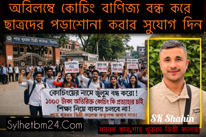 আমরা সংশ্লিষ্ট কর্তৃপক্ষের কাছে জোর দাবি জানাচ্ছি—অবিলম্বে জোরপূর্বক কোচিং বাণিজ্য বন্ধ করতে হবে এবং কোনো ধরনের পূর্ব নোটিশ ছাড়া বেতন ও ফি আদায়ের প্রক্রিয়া স্থগিত করতে হবে। শিক্ষার্থীদের স্বার্থ রক্ষা এবং শিক্ষার সুষ্ঠু পরিবেশ বজায় রাখতে দ্রুত কার্যকর পদক্ষেপ গ্রহণ করা অত্যন্ত জরুরি।
