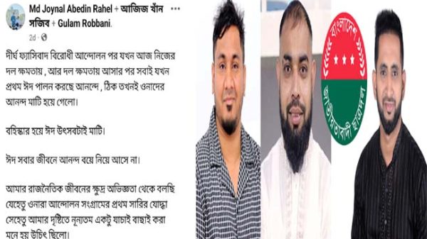 “দীর্ঘ ফ্যাসিবাদ বিরোধী আন্দোলন পর যখন আজ নিজের দল ক্ষমতায়, আর দল ক্ষমতায় আসার পর সবাই যখন প্রথম ঈদ পালন করছে আনন্দে, ঠিক তখনই ওনাদের আনন্দ মাটি হয়ে গেলো। বহিষ্কার হয়ে ঈদ উৎসবটাই মাটি। ঈদ সবার জীবনে আনন্দ বয়ে নিয়ে আসে না।”
