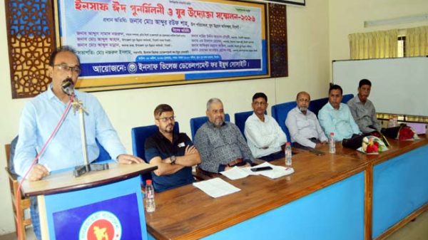 “বর্তমান সরকার তারুণ্যের শক্তিকে কাজে লাগিয়ে ‘স্মার্ট বাংলাদেশ’ গড়তে বদ্ধপরিকর। সিলেটের যুব সমাজ অত্যন্ত মেধাবী, কিন্তু সঠিক দিকনির্দেশনার অভাবে তারা অনেক সময় পিছিয়ে থাকে। ইনসাফ সোসাইটির এই উদ্যোগ তরুণদের সেই সঠিক পথের দিশা দেবে।” তিনি আরও বলেন, “যুব উন্নয়ন অধিদপ্তর থেকে আমরা নামমাত্র সুদে দীর্ঘমেয়াদী ঋণ এবং আধুনিক কারিগরি প্রশিক্ষণ প্রদান করছি। যারা উদ্যোক্তা হতে চান, তাদের জন্য আমাদের দপ্তরের দরজা সবসময় খোলা। কেবল পুঁজি নয়, আধুনিক যুগের সাথে তাল মেলাতে হলে প্রযুক্তিনির্ভর দক্ষতা অর্জন করতে হবে। আমি বিশ্বাস করি, আজকের এই ইনসাফ ইয়ুথ সম্মেলনের মাধ্যমে সিলেটের উদ্যোক্তাদের মধ্যে যে সেতুবন্ধন তৈরি হলো, তা আগামীতে বড় কোনো অর্থনৈতিক বিপ্লবের সূচনা করবে। তিনি বুধবার (৮ এপ্রিল) দুপুরের সিলেট যুব উন্নয়ন অধিদপ্তর যুব ভবন হলরুমে ইনসাফ ভিলেজ ডেভেলপমেন্ট ফর ইয়ুথ সোসাইটি আয়োজিত ইনসাফ ঈদ পুনর্মিলনী ও যুব উদ্যোক্তা সম্মেলন-২০২৬ অনুষ্ঠানে প্রধান অতিথির বক্তব্য উপরুক্ত কথাগুলো বলেন। উক্ত সম্মেলনে সংগঠনের সভাপতি ও জাতীয় যুব পুরস্কার প্রাপ্ত যুব উদ্যোক্তা ও সংগঠক মোঃ নজরুল ইসলামের সভাপতিত্বে ও সংগঠনেরসদস্য ও যুব সংগঠক আলী আহসান হাবিবের পরিচালনায়,